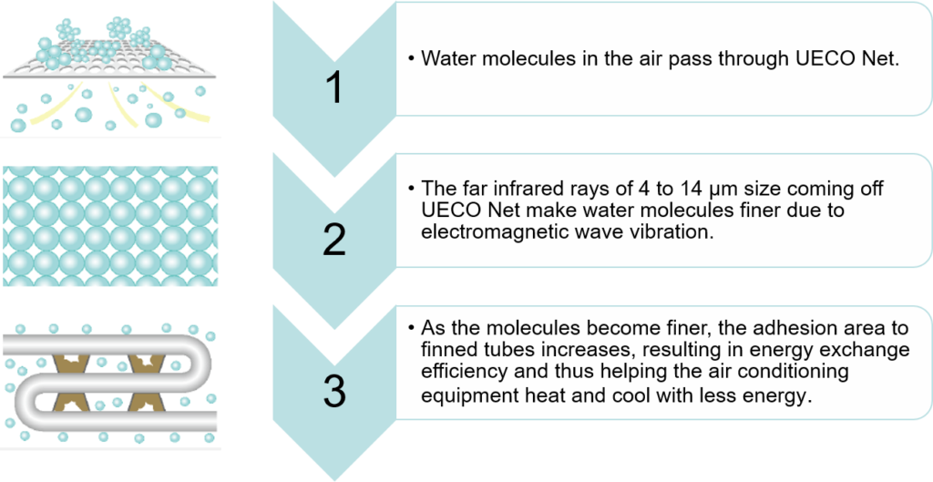 When UECO Net is placed in the air intake vent closest to the heat exchanger of air conditioning equipment, the water molecules in the air become finer, reducing the compressor’s load and improving the heat exchange function simultaneously, which reduces electrical energy usage.